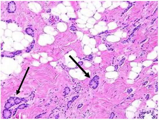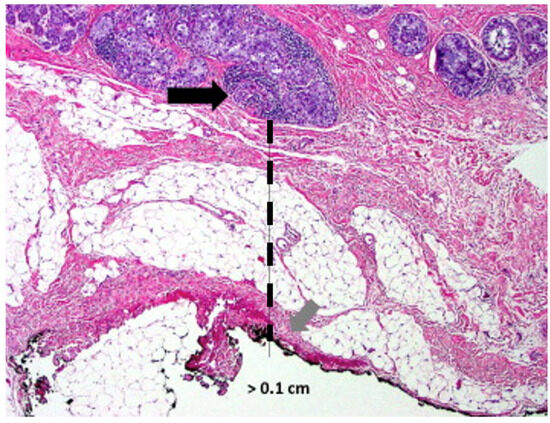 Microscopic image of a lumpectomy specimen showing clusters of cancer cells (arrow) approximately 1 mm (hash line) from the nearest surgical margin.