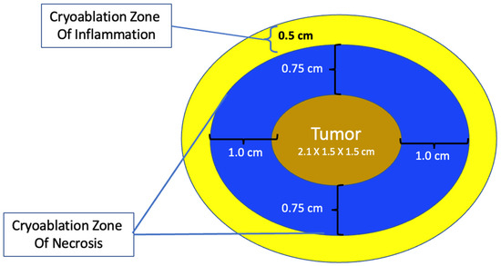 Schematic of cryoablation of a 2 × 1.5 × 1.5 cm tumor within a 4 × 3 × 3 cm cryoablation zone of necrosis and a surrounding 0.5 cm cryoablation zone of inflammation.