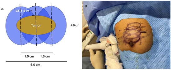 Schematic showing orientation (indicated by hash lines) and recommended spacing (1.5 cm) of adjacent cryoprobes for cancers requiring more than one cryoablation zone of necrosis to minimize gaps between adjacent cryoablation zones of necrosis. Cryoablation zones of inflammation are not shown.