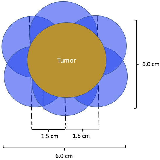 Schematic of a 4 × 4 × 4 cm tumor requiring a minimum of 6 cryoablation zones of necrosis to achieve minimum ablation margins of 1.0 cm. Cryoablation zones of inflammation are not shown.