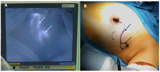 Photographs showing lymphatic mapping with a fluorescent tracer (A) and corresponding skin surface markings (B) identifying the predominant pattern of lymphatic drainage from the areola to the axilla. Arrows indicate the path of lymphatic channels.
