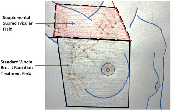Figure showing radiation treatment field for standard whole breast (radiation area enclosed with solid lines) and the supplemental radiation field below and above the clavicle for a patient with multiple positive axillary lymph nodes (area enclosed with hash lines).