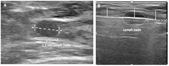 Ultrasound of the axilla. Axillary ultrasound permits the detection of abnormal appearing lymph nodes that might not be detected on physical examination, mammography, or breast MRI. Axillary ultrasound is the most sensitive imaging study for the detection of subtle changes in the shape or thickness of a lymph node cortex that might indicate the presence of lymph node metastasis (Figure 3). Detection of suspicious lymph nodes determines clinical cancer stage and requires a specific plan to manage the possibility of lymph node metastasis.