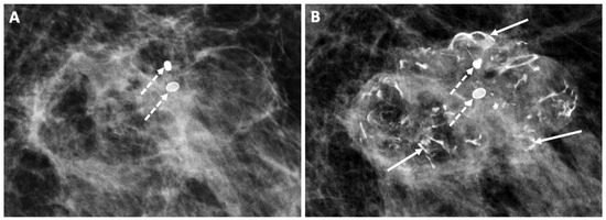 Follow-up mammograms showing an example of increasing macrocalcifications indicative of fat necrosis developing 1 year (A) and 2 years (B) after cryoablation. Only two macrocalcifications were present in 1 year (broken arrows), but by year 2, numerous additional macrocalcifications had developed (solid arrows).