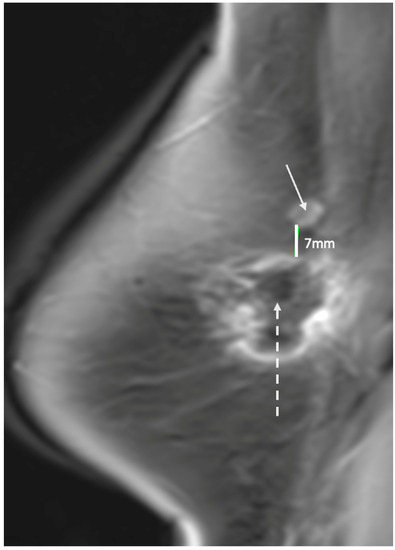 Contrast enhanced breast MRI showing new area of suspicious enhancement (indicated by solid arrow) suggestive of a recurrence 7 mm superior to spherical cryoablation zone of necrosis (indicated by broken arrow).