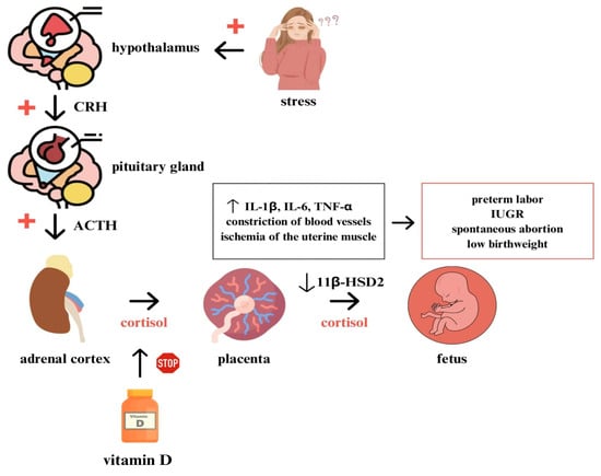 Effects of over-activation of the hypothalamic–pituitary–adrenal axis (HPA axis) on the course of pregnancy. Stress factors overactivate the HPA axis resulting in the increase of maternal corticotropin-releasing hormone (CRH) and adrenocorticotropic hormone (ACTH) levels. That results in the subsequent increase of endogenous levels of cortisol in maternal plasma and placenta, a decrease in 11β-hydroxysteroid dehydrogenase type 2 (11β-HSD2) activity and the formation of an inflammatory environment in the placenta—increased levels of interleukin-1 β (IL-1β), interleukin-6 (IL-6) and tumor necrosis factor α (TNF-α). Vitamin D reduces endogenous cortisol levels. Obstetric consequences of the described disorders include preterm labor, intrauterine growth restriction (IUGR), spontaneous abortion and low birth weight.