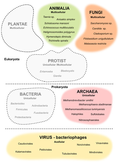 Archaea are everywhere, and although they have not been associated with pathogenesis, several studies have shown certain relations with human diseases [119]. They have been the forgotten players in the study of the microbiome [120]. However, in the latest decade, several species have been isolated from human skin and the nose, lung, oral cavity, vagina, and GI tract [121,122], pointing to the importance of considering these microorganisms in future studies of the human microbiota and their possible implication in diseases. Archaea represent a small proportion of the total gut microbiota [123,124,125], but their implication in human health and gut diseases has become an important research topic lately.