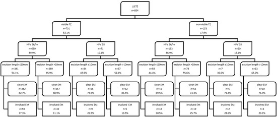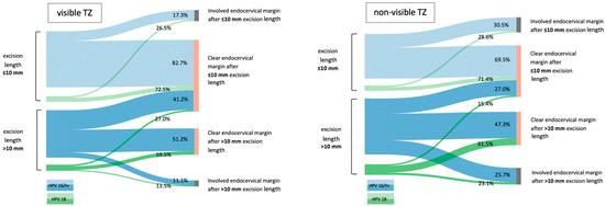 In this retrospective single-center cohort study, we identified 1035 patients who underwent LLETZ for cervical neoplasia between 2013 and 2021, of whom 181 patients had to be excluded, resulting in 854 cases eligible for analysis. Inclusion criteria were as follows: (i) preoperative colposcopy with documentation of the TZ; (ii) preoperative analysis of the hr-HPV status; (iii) LLETZ at the Department of Obstetrics and Gynecology, Medical University of Vienna; (iv) measurement of cone dimensions. Exclusion criteria were as follows: (i) ≤18 years of age; (ii) LLETZ before January 2013 or after December 2021; (iii) pregnancy. Cervical cytology via PAP smear as well as a colposcopy including a biopsy was conducted prior to excisional treatment. LLETZ was performed in the operating room, and the surgical specimen was marked by the surgeon at 12 o’clock. All specimens were reviewed and measured by gynecologic pathologists. All three dimensions of the cone were assessed in millimeters, i.e., anteroposterior dimension, transverse dimension and length. TZ was documented in the medical records either as “visible/non-visible” or specified by the three subgroups “TZ 1/2/3”. Hence, in order to perform sub-analysis, TZ type 1 (squamocolumnar junction completely visible) and type 2 (i.e., squamocolumnar junction partially visible) were merged into the subgroup “fully visible TZ”, and type 3 (squamocolumnar junction not visible) was denoted “non-visible TZ” [9,10]. A cone resection of ≤ 10 mm of length was performed by removing one specimen with a large loop in a standard fashion. In case of an excision length of > 10 mm, a two-step procedure was performed by first removing a specimen of the ectocervically situated TZ (not more than 10 mm of length) followed by an additional smaller loop to remove the endocervical part of the TZ, resulting in a total length of both specimens of more than 10 mm. The type of excision was applied according to the surgeons’ clinical assessment due to the TZ type and expansion of the lesion or upon informed patients’ request, preferring oncological safety rather than low risk of preterm delivery. Since an excisional treatment of removing more than 10 mm cervical tissue is known to be an independent risk factor for adverse pregnancy events, we chose to compare two subgroups with a cut-off value of 10 mm to provide data for informed patient education, particularly for women of childbearing age with a desire to get pregnant [15]. Given the fact that an involved endocervical margin is especially known to be a predictor for treatment failure, i.e., persistent disease, we chose to evaluate only the endocervical margin status [12,22]. Endocervical margin positivity was referred to histological confirmation of HSIL or carcinoma on the surgical margin and designated as “involved” or “clear”. Hr-HPV genotypes were diagnosed using the “cobas HPV test” (Roche Diagnostics, Indianapolis, Indiana) and described individually (HPV 16 and 18) or in a pooled category reported as other high-risk HPV (HPV 31, 33, 35, 39, 45, 51, 52, 56, 58, 59, 66 and 68). For sub-analyses, hr-HPV types were grouped according to specific oncological characteristics. HPV 18 is more likely to cause potentially endocervical adenocarcinoma in situ (AIS), while HPV 16 and other hr-HPV (“HPV 16/hr”) types are predominantly causing squamous cell carcinoma (SCC) [23,24]. Clinical and pathological data were extracted retrospectively from medical records. The main outcome measures were excision length, TZ type, hr-HPV status and endocervical margin status. In addition, the following clinical parameters were included: age of the patient at LLETZ, cervical cytology diagnosed by a PAP smear, histological result of colposcopic biopsy and LLETZ specimen. Nominal variables are reported as numbers and frequencies, and continuous variables are reported as medians and interquartile ranges (IQRs). Statistical analyses were performed with SPSS v26 (released 2019, IBM Corp., Armonk, NY, USA) using the Mann–Whitney U test or the Pearson’s chi-square test, where appropriate. A univariate analysis was performed in order to evaluate the effect of an excision length > 10 mm on the endocervical resection margin of the specimen. A two-sided p value < 0.05 was considered significant. Figures were generated using Microsoft Word (version 16.43) and SankeyMATIC software.