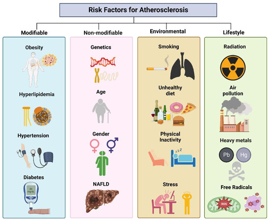 Risk factors, including hypertension, smoking, diabetes, and dyslipidemia, can prompt atherosclerosis [17]. These risk factors are classified as modifiable and non-modifiable (Figure 1). Hypertension is a significant risk factor for developing atherosclerosis, and its chronic form detrimentally impacts the endothelial lining of the arteries, rendering them prone to lipid deposition and inflammatory cell expansion. Hypertension upsurges the strain on the heart, leading the artery walls to thicken and stiffen. Tobacco smoke incorporates chemicals that induce endothelial dysfunction, augment inflammation, and lead to fatty plaque formation inside artery walls. Smoking also lowers high-density lipoprotein (HDL) cholesterol levels, the “good” cholesterol, which assists in normalizing the overall blood cholesterol level [18]. Hyperlipidemia can cause elevated blood glucose levels, leading to diabetes and hasten plaque formation and endothelial damage [19]. Men are more inclined than premenopausal [20] to suffer from atherosclerosis. However, the risk juxtaposes in postmenopausal women [21,22]. Notably, these risk factors often interact and worsen the other’s consequences. These factors, including obesity, hyperlipidemia, hypertension, and diabetes, can be managed and controlled by lifestyle changes, regular medical check-ups, and medications that can reduce the clinical consequences [23]. In contrast, there are also non-modifiable factors of atherosclerosis etiology, i.e., genetics, gender, chronic nonalcoholic fatty liver disease (NAFLD), habitat, and environmental factors.