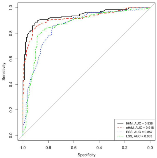 ROC eH/M, lH/M, ESS and LSS (eH/M: early heart-to-mediastinum ratio, lH/M: delayed heart-to-mediastinum ratio, ESS: early summed score, LSS: late summed score), AUC: area under the curve.