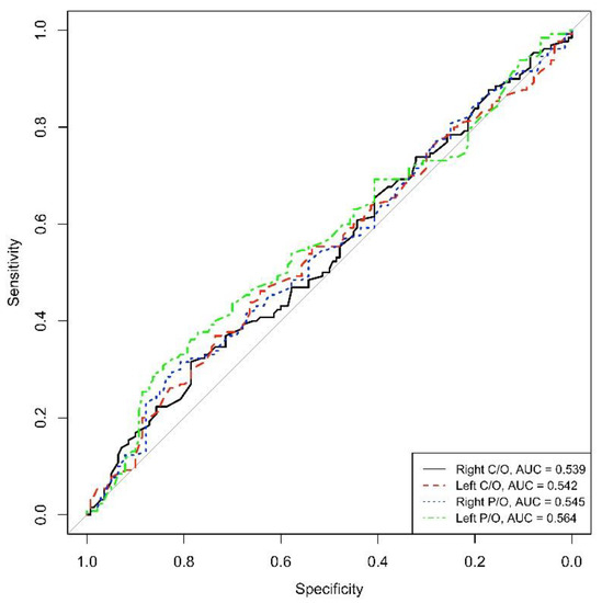 On the contrary, the AUC calculated for the DAT-SPECT parameters did not reveal high values of sensitivity and specificity for the diagnosis of PD in those de novo patients (AUC = 0.539 for right C/O, AUC = 0.542 for left C/O, AUC = 0.545 for right P/O and AUC = 0.564 for left P/O) (See Figure 2).