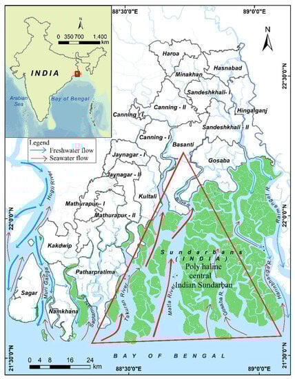 - Zaman, S.; Bhattacharyya, S.B.; Pramanick, P.; Raha, A.K.; Chakraborty, S.; Mitra, A. Rising water salinity: A threat to mangroves of Indian Sundarbans. In Water Insecurity: A Social Dilemma (Community, Environment and Disaster Risk Management); Abedin, M.A., Habiba, U., Shaw, R., Eds.; Emerald Group Publishing Limited: Bingley, UK, 2014; pp. 167–183. [Google Scholar]
