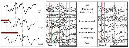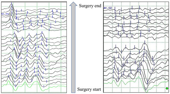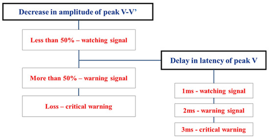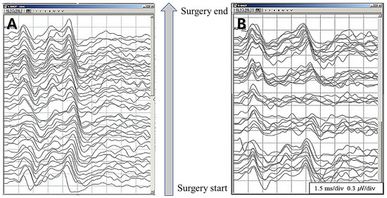 - James, M.L.; Husain, A.M. Brainstem auditory evoked potential monitoring: When is change in wave V significant? Neurology 2005, 65, 1551–1555. [Google Scholar] [CrossRef] [PubMed]