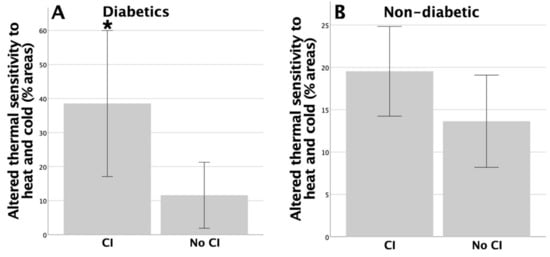 Significant differences were found for altered thermal sensation between patients with and without cognitive impairment (CI) in the diabetic group (* p = 0.044) (A), and no significant differences were found in the non-diabetic group (B).