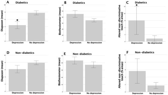 Significant differences were found in vibration sensation by using a tuning fork (* p = 0.008) and in altered non-discriminative touch (* p = 0.049; (A,C)), with trends being found for vibratory sensation using a biothesiometer (p = 0.070; (B)), and between patients with and without depression in the diabetic group, with no significant differences being found between these two groups among the non-diabetic patients (D–F).