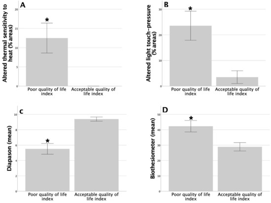 Significant differences among diabetic patients in terms of altered thermal sensation to heat (* p = 0.032; (A)), light touch pressure (* p = 0.027; (B)), vibratory sensation by tuning fork (* p = 0.004; (C)), and vibratory sensation by biothesiometer (* p = 0.042; (D)) between diabetic patients with a poor or acceptable quality of life index.