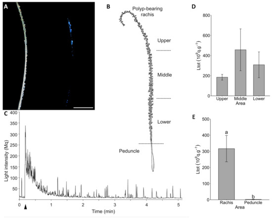 Luminescence capability analyses on Funiculina quadrangularis. (A) Picture of Funiculina colony in dim light (left) and emitting waves of luminescence upon a mechanical stimulation (right) (Dr. E. Infantes pictures). (B) Representation of a Funiculina colony showing the different experimental parts used (polyp-bearing rachis and peduncle). (C) Original recording of KCl application on polyp-bearing rachis. Arrowhead indicates the KCl application. (D) Total amount of light (Ltot) produced by polyp-bearing rachis portion under KCl application depending on the position along the colony (n = 5). (E) Comparison between the Ltot produced by polyp-bearing rachis (n = 15) and the peduncle (n = 10) parts of the colony under KCl application. All Ltot values are expressed as 109 q s−1 g−1. Different lettering indicates statistical differences. Error bars correspond to s.e.m. Scale bar = 1 cm.