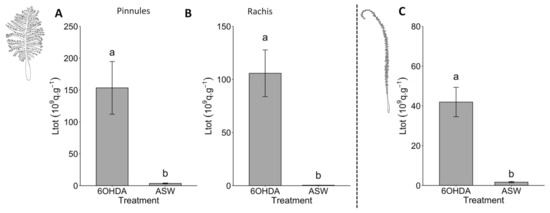 Application of the 6-OHDA 10−6 mol L−1 solution on Pennatula pinnules resulted in a drastic increase in light production (Ltot = 153.46 ± 41.38 × 109 q s−1) compared to the application of ASW (Ltot = 3.51 ± 0.65 × 109 q s−1) (pairwise Wilcoxon test, p-value < 2.2 × 10−16; Figure 3A). Similar results were observed for the rachis with a Ltot value of 105.82 ± 21.98 × 109 q s−1 for the 6-OHDA 10−6 mol L−1 application and of 0.41 ± 0.05 × 109 q s−1 for the ASW application (Student t-test, p-value < 2.2 × 10−16; Figure 3B). Similarly, 6-OHDA 10−6 mol L−1 application on Funiculina rachis resulted in an increase in luminescence production (Ltot = 41.9 ± 7.4 × 109 q s−1) compared to the ASW control (Ltot = 1.6 ± 0.3 × 109 q s−1) (Student t-test, p-value = 0.0002; Figure 3C).