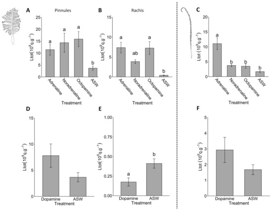 Pharmacological analyses on Pennatula phosphorea and Funiculina quadrangularis luminescence control. Comparison between the total amount of light (Ltot) produced by (A) pinnules (n = 62), and (B) the rachis (n = 20) of P. phosphorea, and (C) the rachis (n = 12) of F. quadrangularis after adrenaline, noradrenaline or octopamine applications at 10−6 mol L−1. Comparison between the Ltot produced by (D) pinnules (n = 20), and (E) the rachis (n = 20) of P. phosphorea, and (F) the rachis (n = 12) of F. quadrangularis after dopamine application at 10−6 mol L−1 and ASW control. All Ltot values are expressed as 109 q s−1 g−1. Different lettering indicates statistical differences. ASW: artificial seawater. Error bars correspond to s.e.m.