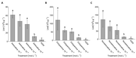 At higher concentrations (10−3 to 10−5 mol L−1), adrenaline, noradrenaline, and octopamine application on Pennatula pinnules presented an increase in the total light emission compared to the 10−6 mol L−1 applications (Figure 5; Table S1). At concentrations of 10−3 and 10−4 mol L−1, noradrenaline and octopamine presented a higher response than adrenaline.