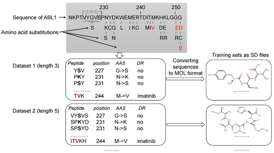 Creation of the training sets. Drug-resistant and nonresistant AASs were revealed in COSMIC and annotated. The AASs were mapped on ABL1 sequence. A peptide with the appropriate length and AAS in the center was generated for each AAS position. According to the length of peptides (from 3 to 31 amino acid residues), 15 datasets were created. These datasets were converted to 15 SD files with description of structural formulas of peptides in MOL V3000 format and classes of annotation. Red letters—AAS associated with drug resistance to imatinib. Black bold letters—AASs not associated with drug resistance. DR—drug resistance.
