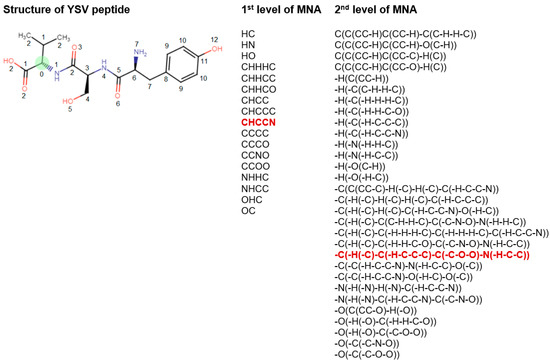 Description of structural formula of YSV peptide by the lists of 1st and 2nd levels of MNA descriptors. The numbers close to the atoms display the most distant atoms included in the MNA descriptor of the appropriate level for green C atom. The selected MNA level is used in the model, sets of such descriptors are generated for the each of atoms. Red—MNA descriptors of 1st and 2nd levels for green C atom. The name of atoms is considered the zero level of MNA descriptors.