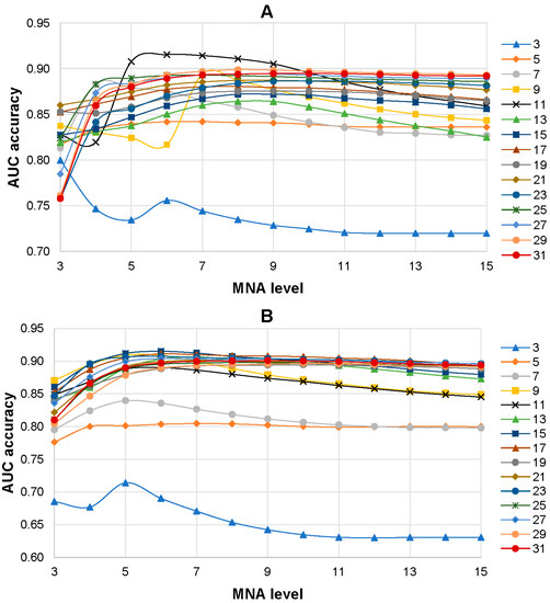 Dependence average AUC values from the level of MNA descriptors and the length of peptides in the training set for ABL1 1st (A) and 2nd (B) isoforms. The legend of the figure shows the correspondence between the color with signs and length of the peptides in the training set.