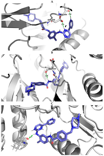 PyMOL visualization of imatinib-ABL1 interaction for (A) wild type of protein, (B) protein with E334V amino acid substitution and (C) protein with T392I amino acid substitution. Blue molecule—imatinib; Green—hydrogen bonds; Red—oxigen; Dark blue—nitrogen.