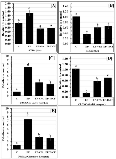 Changes in mRNA gene expression (Relative to control) for some gate receptors Panel (A): SCN1A (Na+); Panel (B): KCNJ2 (K+); Panel (C): CACNA1S Ca++; (Cav1.1); Panel (D): CLCNC (GABA receptor), and Panel (E): NMDA (Glutamate Receptor) in hippocampal homogenate tissues of different groups: Control (C), epileptic (EP), EP-VPA, and Culture Filtrate of Trichoderma harzianum–treated (E-ThCF). Values were represented as Mean ± SD & n = 8 animals. Means within the same parameter and not sharing a common superscript symbol(s) differ significantly at p < 0.05.
