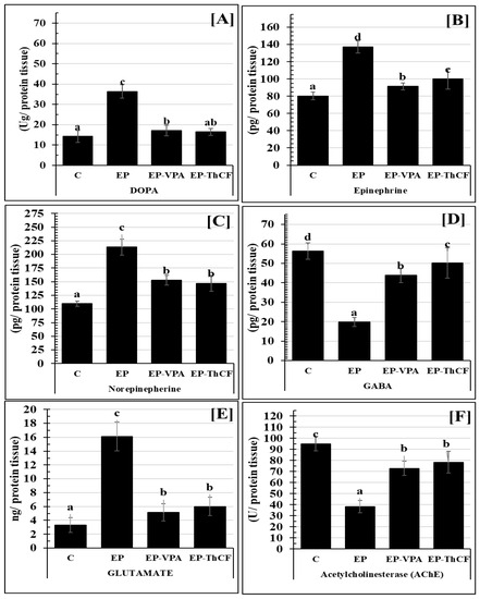 Concerning changes in the neurotransmitters in hippocampal homogenate tissues, e.g., DOPA (Ug/protein tissue), epinephrine (pg/mg protein tissue), norepinephrine (pg/mg protein tissue), and glutamate (ng/mg protein tissue), Figure 2 illustrate a very highly significant increase, recording 36.40 ± 3.39 (F = 139.238 and p < 0.001); 137.34 ± 7.09 (F = 88.048 and p < 0.001); 213.41 ± 14.84 (F = 87.346 and p < 0.001), and 16.11 ± 2.08 (F = 117.106 and p < 0.001)), respectively. Treatments with EP-VPA or ThCF improved this significant change and returned them to near control levels as illustrated in Figure 3. On the other hand, both GABA (Figure 3D) and acetylcholine-esterase (Figure 3F) were significantly improved to the control level (56.28 ± 4.18 and 94.96 ± 6.48, respectively) either by treatment with EP-VPA (43.79 ± 3.61 with F = 138.638 and p < 0.001) and 50.22 ± 7.72 with F = 89.662 and p < 0.001), respectively) or ThCF (72.81 ± 6.53 and 78.40 ± 9.91, respectively) (Figure 3).