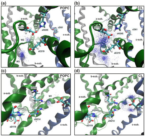 In the model POPC membrane, proton transfer from aAsn214 and aGln252 was carried out to cAsp61 only via the structural water molecule W1 that we discovered in all simulations [33] (Figure 5c). In the presence of CL, instead of the single favorable position of the structural molecule of water W1, a greater conformational freedom of water around cAsp61 was found. Therefore, the indication W1 now describes the several molecules due to the increased hydration in membranes containing CL. The most probable localizations of water molecules were determined (Figure 5d, blue dots), which were located at a distance of less than 3 Å from cAsp61. It can currently be easily protonated through the cluster W1 consisting of 2–3 structural water molecules. In addition, we detected the formation of a long continuous chain of well-ordered water molecules, through which the proton could reach the key cAsp61 from the aqueous lacuna entrance directly. Nevertheless, this chain was constantly broken in the region of significant amino acid residues aAsp119, aHis245, and aAsn214, aGln252, that confirms their importance in the proton transport process (Figure 4d).