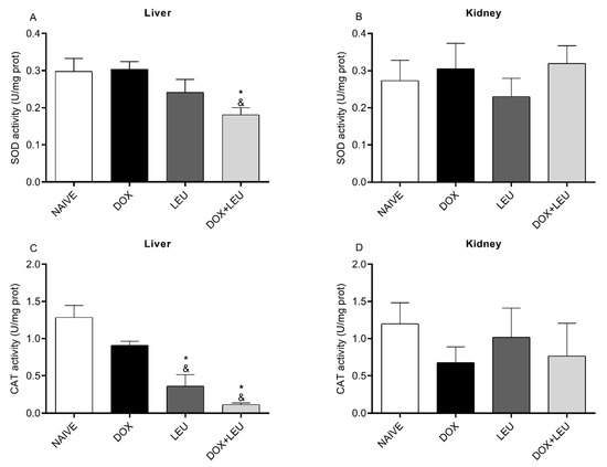Superoxide dismutase (A,B) and catalase (C,D) activities in the liver and kidney of control rats (NAIVE), supplemented with doxorubicin (DOX), leucine (LEU) and doxorubicin + leucine (DOX + LEU). ANOVA followed by Tukey’s test. Values expressed as mean ± standard error of the mean. * vs. NAÏVE; & vs. DOX. The differences were considered significant when p < 0.05.
