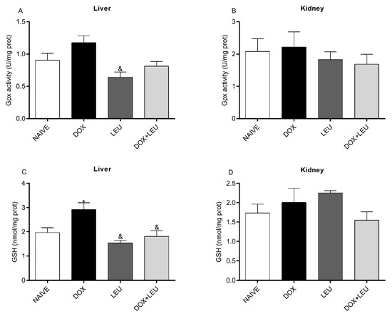 The activity of glutathione peroxidase (GPx) (A,B) and levels of reduced glutathione (GSH) (C,D) in the liver and kidney of control rats (Naive), supplemented with Doxorubicin (DOX), Leucine (LEU) and Doxorubicin + Leucine (DOX + LEU). ANOVA followed by Tukey’s test. Values expressed as mean ± standard error of the mean. * vs. NAIVE; & vs. DOX. The differences were considered significant when p < 0.05.
