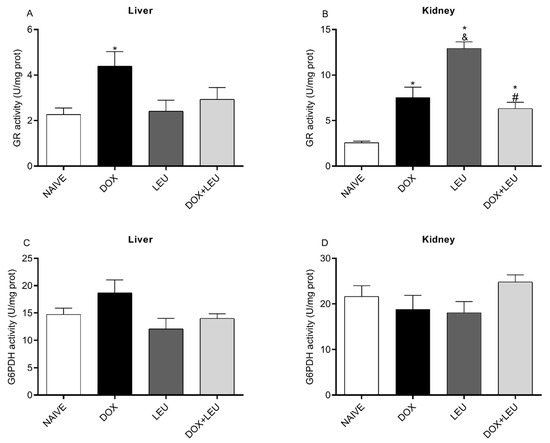 The activity of glutathione reductase (GR) (A,B) and glucose-6-phosphate dehydrogenase (G6PDH) (C,D) in the liver and kidney of control rats (NAIVE), supplemented with doxorubicin (DOX), leucine (LEU) and doxorubicin + leucine (DOX + LEU). ANOVA followed by Tukey’s test. Values expressed as mean ± standard error of the mean. * vs. NAÏVE; # vs. L; & vs. DOX. The differences were considered significant when p < 0.05.