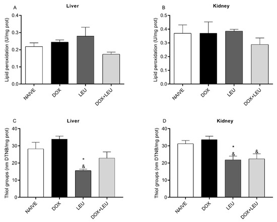 Levels of lipid peroxidation (A,B) and thiol groups (C,D) in the liver and kidney of control rats (NAIVE), supplemented with doxorubicin (DOX), leucine (LEU) and doxorubicin + leucine (DOX + LEU). ANOVA followed by Tukey’s test. Values expressed as mean ± SEM. * vs. C; & vs. D. The differences were considered significant when p < 0.05.