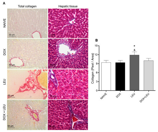 As shown in Figure 5A, it is possible to observe a triacylglycerol accumulation in the liver in the LEU and DOX + LEU groups. Figure 5A,B show the collagen deposition that occurred in the liver of the LEU group compared to NAIVE and DOX groups.