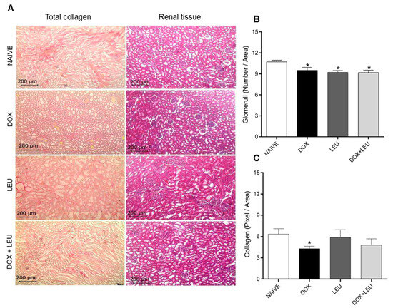As for the renal tissue, degenerations were not observed as shown in Figure 6A, but Figure 6B shows a reduction in the number of glomeruli numbers in the DOX, LEU, and DOX + LEU groups compared to the NAIVE group. There were less collagen deposits in the kidneys of the DOX group when compared to the NAIVE group.