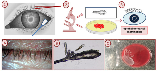 Schematic illustration of research methodology. (1,2) Parasitological examination of eyelashes and microbiological examination from the conjunctival sac. (3) Clinical examination; (A,B) collarettes, the pathognomonic sign of Demodex blepharitis: lash sampling and microscopic examination reveal cylindrical dandruff harboring mites; and (C) Staphylococcus aureus on Columbia agar with 5% defibrinated sheep blood.