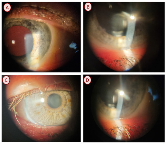 Staphylococcus aureus was observed in an adult male patient with no chronic diseases. Mature forms of D. folliculorum were observed on the eyelashes in the microscopic examination. Ophthalmic examination showed that the visual acuity (VA) of the right and left eye was 1.0, and the intraocular pressure (IOP) of the right eye was 11.7 mmHg and 10.7 mmHg, respectively. Anterior segment examination using a slit-lamp showed cylindrical dandruff on the upper eyelid and blockage of the Meibomian glands (Figure 2A).
