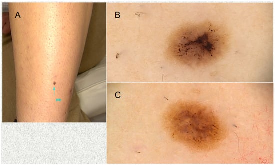 A nevus consists of melanocytes and melanin, and photons of the lasers used for hair removal might be absorbed by the melanocytes of the nevus and cause subsequent thermal injury [14,15]. Photoepilation is widely used for hair removal and involves the use of lasers (long-pulsed alexandrite laser (755 nm), diode laser (800–810 nm), neodymium:yttrium-aluminum-garnet (Nd:YAG) laser (1064 nm), and ruby laser (694 nm)) or intense pulsed light (IPL) sources [15,16]. Atypical findings have been noted in pigmented lesions after laser or IPL hair removal (named photoepilation hereafter), either as new findings or as changed lesions. Such findings prompt several diagnostic approaches, including dermoscopy and histopathology, in order to establish an unequivocal diagnosis.