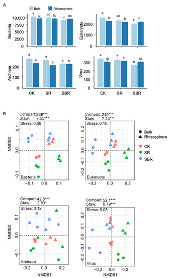 Soil diversity and community composition in rhizosphere and bulk soil. In panel (A), is the richness. Different letters indicate significant differences (p < 0.05) tested by ANOVA. In panel (B), the biplot of NMDS for community compositions, the contributions of compartments (bulk vs. rhizosphere) and straw application (CK, SR, and SBR) were tested by permANOVA, *, p < 0.05; ***, p < 0.001.