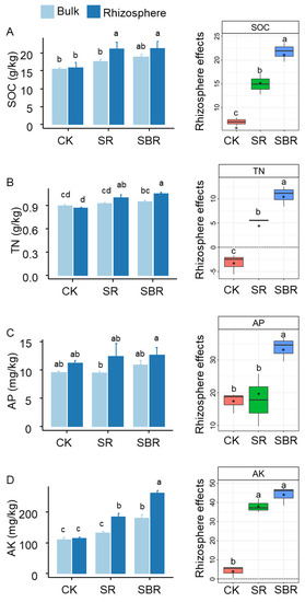 Resource availability in rhizosphere and bulk soil. (A) SOC, soil organic carbon; (B) TN, soil total nitrogen; (C) AP, soil available phosphorus; (D) AK, soil available potassium; Different letters indicate significant differences, p < 0.05 tested by ANOVA. The average rhizosphere effects annotated with * were significantly (p < 0.05) different from zero tested by the t-test.