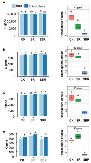 Straw biochar resulted in the lowest rhizosphere effects on soil carbon genes (Figure 3A), soil nitrogen genes (Figure 3B), phosphorus genes (Figure 3C), and potassium genes (Figure 3D). With the negative values of rhizosphere effects for carbon, nitrogen, and phosphorus genes, the rhizosphere effects were positive for potassium genes (Figure 3A–D).