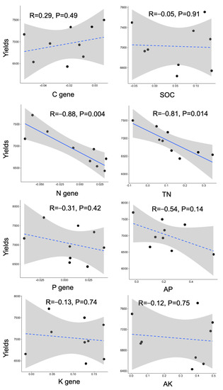 The relationships between crop yields and rhizosphere effects, represented by the nutrient contents and metabolism genes involved in nitrogen cycling, were mainly significant (Figure 4). Negative relationships were found for both nitrogen contents and nitrogen genes, with the R values both greater than 0.8.