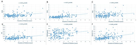Plot representation of the dispersion of data of the correlation between duration of diabetes (years) and (A) MLR (r = 0.331, p < 0.001), (B) NLR (r = 0.517, p < 0.001), (C) PLR (r = 0.296, p < 0.001), (D) SII (r = 0.413, p < 0.001), (E) BMI (r = 0.241, p < 0.001), and (F) HbA1C (r = 0.489, p < 0.001).