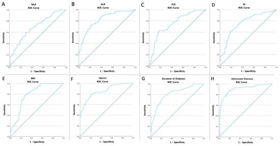 The ROC curve graphics regarding the prediction of SA in PN patients for (A) MLR (AUC:0.689, p < 0.0001), (B) NLR (AUC:0.820, p < 0.0001), (C) PLR (AUC:0.751, p < 0.0001), (D) SII (AUC:0.759, p < 0.0001), (E) BMI (AUC:0.793, p < 0.0001), (F) HbA1C (AUC:0.857, p < 0.0001), (G) duration of diabetes (AUC:0.812 p < 0.0001), and (H) admission glucose (AUC:0.899, p < 0.0001).