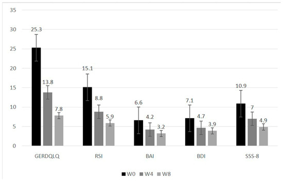 3.2. Sequential Change of Reflux Symptom Score and Psychosomatic Assessments after Treatment