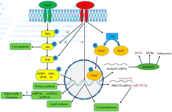 Under the stimulation of prolactin and insulin, a series of signaling pathways were activated to enhance protein synthesis in crop epidermal cells, such as the target of rapamycin (TOR), Janus kinases/signal transducer and activator of transcription proteins (JAK/STAT), and insulin receptor substance 1/protein kinase B/target of rapamycin (IRS1/Akt/TOR) signaling pathway. In mammals, the mammalian target of rapamycin (mTOR) signaling pathway has been shown to play an important role in the synthesis of milk proteins by changing the phosphorylation status of downstream effector proteins, such as eukaryotic initiation factor 4E binding protein 1 (4EBP1) and ribosomal protein S6 kinase (70S6K) [115,116,117,118,119]. Targeted disruption of the target of rapamycin complex 1 (TORC1) inhibited protein synthesis in pigeon crop, thereby retarding the growth of squabs [120]. Dietary supplementation with leucine promoted the growth of squabs and increased the synthesis of pigeon milk protein through the TOR signaling pathway [51], which is consistent with that in mammary glands [121]. Meanwhile, DL-methionine or DL-methionine-DL-methionine supplementation to the parent diet significantly enhanced protein synthesis in crop tissue by the JAK2/STAT5 signaling pathway [52]. In addition, the synthesis of protein in crop epidermal cells was also enhanced through activation of the IRS1/Akt/TOR signaling pathway [50]. The avian prolactin receptor consists of two repeats of the extracellular ligand-binding domain. Binding of prolactin to its receptor leads to phosphorylation of one or more STAT proteins through activation of JAK [52,55]. Then, the STAT protein is translocated into the nucleus and interacts with sites of the anxIcp35 gene and other potential genes to regulate their transcription. The anxIcp35 protein was engaged in the formation and trafficking of endocytotic vesicles (ECVs) and multivesicular bodies (MVBs), which are very important for the uptake of extracellular nutrients [55,122,123]. At the same time, anxIcp35 is also involved in protein synthesis in pigeon crop [94,124].