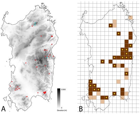 Map of Sardinia with the 64 observations of Natrix helvetica cetti provided with geographical indications: the red dots represent the post-2010 records, and the blue dots represent the pre-2010 ones (A). A 10 × 10 km UTM map of Sardinia with the updated distribution of N. h. cetti: the brown squares represent records from 2010 onwards, the beige squares represent pre-2010 records; brown squares with yellow dots represent new squares or reconfirmations of pre-2010 data with respect to what is indicated in [12] (B).