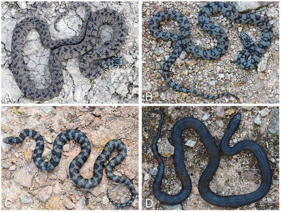 As highlighted by various authors (e.g., [24,28,45,69]), Natrix helvetica cetti includes grass snake populations with highly distinctive phenotypes. The chromatic pattern presents a peculiar expansion and fusion of its dark elements. Unlike other populations of N. helvetica, the dorsal and lateral series of transverse blotches often tend to merge and form large rings that split on the sides [28,45]. The neck is usually adorned with a large dark ring and the typical yellow or whitish nuchal collar, often present in mainland populations, is completely missing, even in the youngest individuals [24,45]. A large and irregular dark spot is generally present in the area of the parietal scales; furthermore, the remaining cephalic scales have dark edges of variable thickness. Cases of melanism are known for the Sardinian grass snake [15,25,28,81,82].
